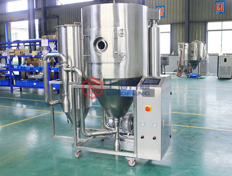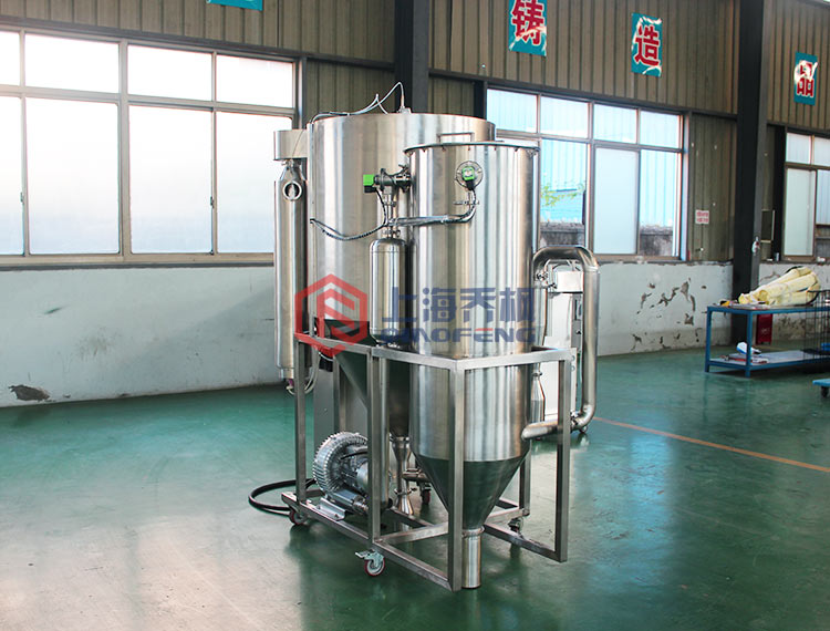 壓力噴霧干燥機是一種可以同時完成干燥和造粒的裝置。按工藝要求可以調節料液泵的壓力,流量,噴孔的大小,得到所需的按一定大小比例的球形顆粒。