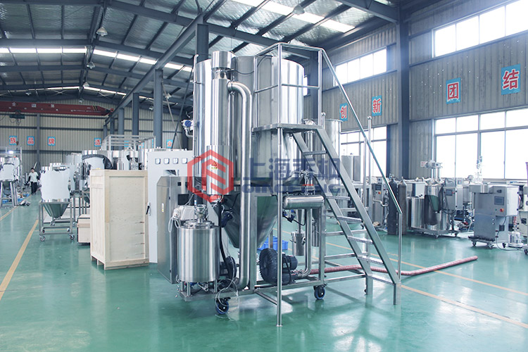 為了防止材料受到污染并延長設(shè)備的使用壽命,與材料接觸的所有部件均由不銹鋼制成。 噴涂后,液體霧化成分散的顆粒,表面積大大增加。 在與熱空氣接觸后,干燥過程可以在很短的時間內(nèi)完成。 在正常條件下,100%至98%的水可在100至150℃下蒸發(fā)1至3秒。 由于干燥過程在瞬間完成,因此最終產(chǎn)品的顆粒可以基本上保持與液滴類似的球形,從而具有良好的分散性,優(yōu)異的可沖泡性和高溶解性。